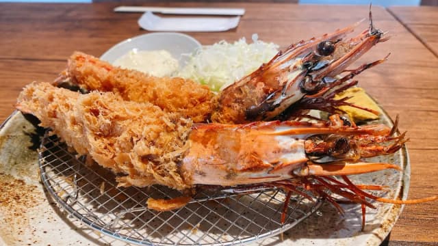 ミックスフライ定食:国産ヒレかつと特大エビフライを一度に楽しめる人気の盛り合わせ定食。