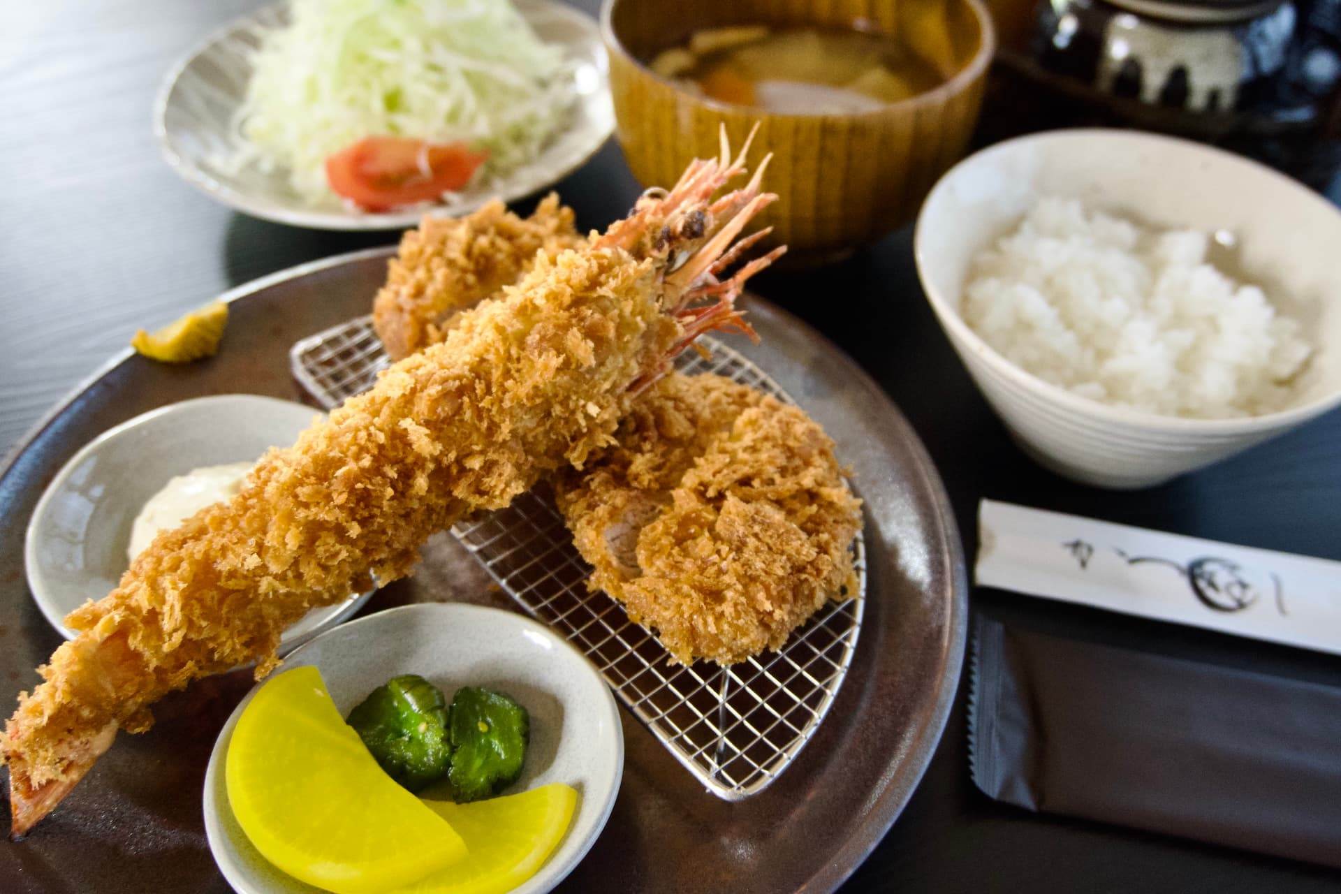 エビフライ定食:約20cmの大きなエビを2尾使用した、ボリュームたっぷりの一皿。