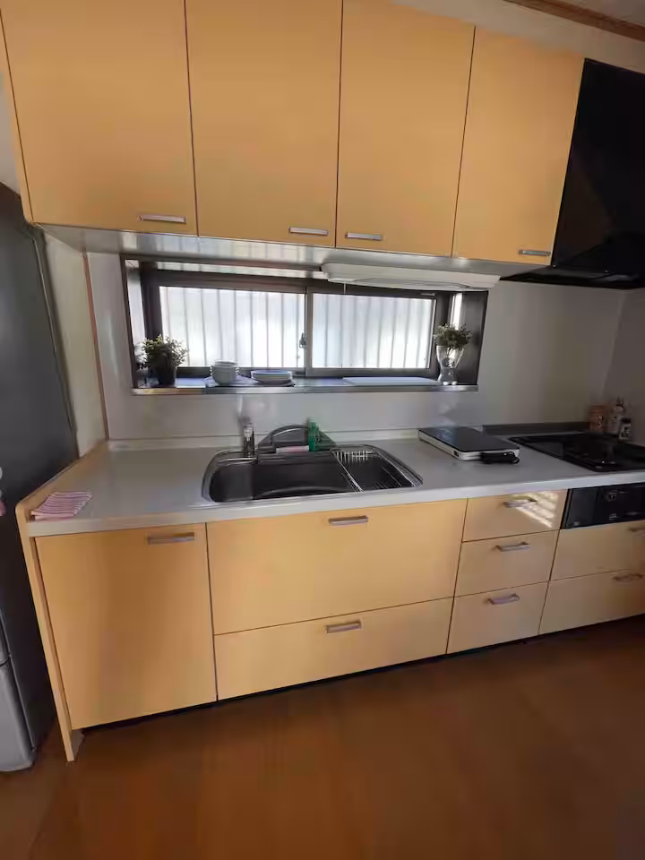 広々としたリビング・ダイニングにはエアコンと暖房設備を完備し、冬季にはガスストーブもご利用いただけます。キッチンには調理器具や家電が一式揃っており、長めの滞在や自炊にも対応しています。