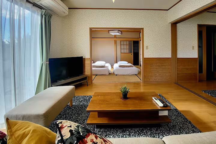 リビングを中心に各部屋が配置されており、家族旅行や友人同士の滞在でも自然と集まりやすい造りです。畳の和室は小さなお子様連れにも安心で、多世代での宿泊にも向いています。