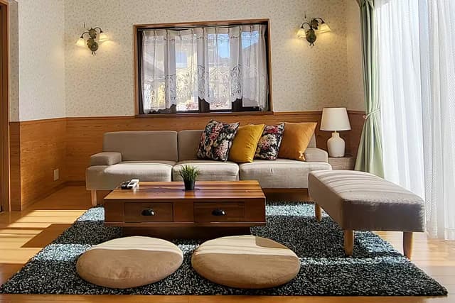 河口湖駅から徒歩約6〜7分。築年数の浅い和風3LDKの一軒家をまるまる貸切でご利用いただけます。天気の良い日にはリビングから雄大な富士山を望むことができ、一年を通して四季折々の表情を楽しめます。最大12名まで宿泊可能で、家族旅行やグループ滞在に適した広さが魅力です。