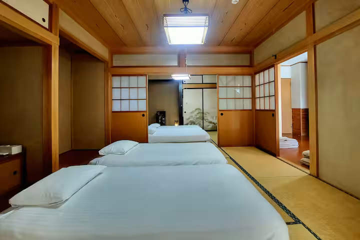 館内には和室を中心とした3LDKの間取りがあり、布団を使用して最大12名まで宿泊可能です。寝具・タオル類は予約人数分をご用意しており、ゆったりとした空間で快適にお休みいただけます。