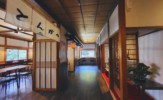 どこか懐かしい日本の暮らしを感じられる温かみのある店内には、明治・大正・昭和の雛人形や古い道具が飾られています。テーブル席を中心に、ひとり旅でもグループでも入りやすいカジュアルな雰囲気。観光の合間に、ほっと一息つける落ち着いた空間です。
