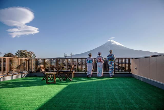 館内には、富士山と河口湖を山頂から裾野まで望む屋上テラスがあり、晴天時や夕景はもちろん、夏の花火大会では迫力ある眺めを楽しめます。ロビー横のラウンジは開放的で、チェックイン前後のひと休みや旅の情報収集に便利です。コインランドリー設備(洗濯機)、自動販売機、電子レンジ、ウォーターサーバーなど、長期滞在にうれしい共用設備も整えております。
