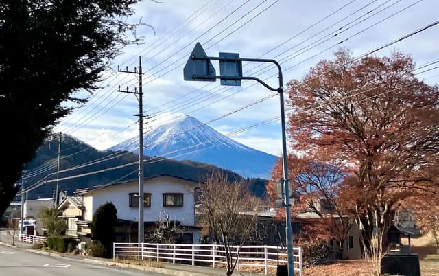 宿泊先は落ち着いた環境にあり、周辺にはコンビニやカフェのほか、神社や美術館などの見どころが点在しています。天気の良い日には、周辺エリアから富士山を望むことができ、散策しながら河口湖らしい景色や雰囲気を楽しめます。