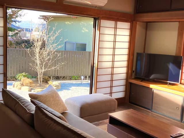広いリビングとダイニング、調理ができるフルキッチンを備え、大人数でも快適に過ごせる造りとなっています。静かな住宅街に位置しつつ、徒歩圏内にはカフェやレストラン、コンビニがあり、旅の利便性も十分です。庭からは富士山を望むことができ、四季折々の景色を楽しみながらゆったりとお過ごしいただけます。
